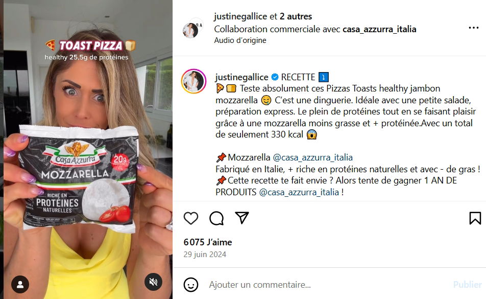 - Deuxièmement, un partenariat d'influence avec Justine Gallice, macro-influenceuse healthy, incluant la création de vidéos et de recettes saines, diffusées sur Instagram et Marmiton.